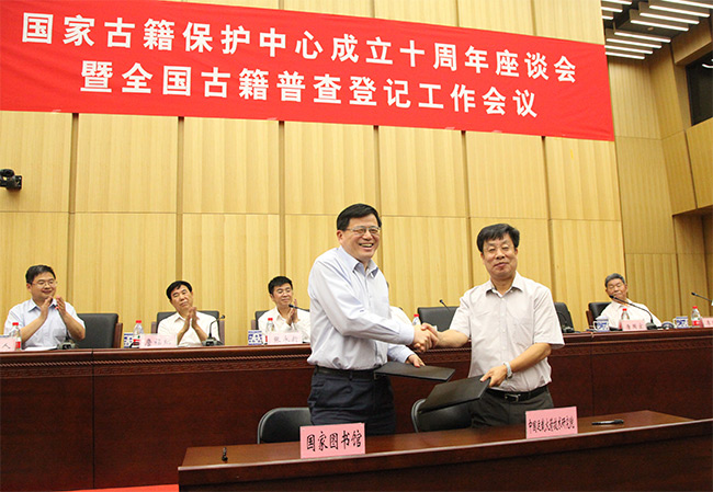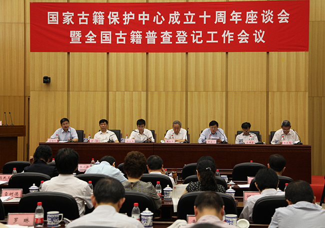 5月25日,国家古籍保护中心成立十周年座谈会在国家图书馆召开。文化部原副部长、国家图书馆名誉馆长周和平,文化部公共文化司司长张永新、副司长陈彬斌,国家图书馆馆长、国家古籍保护中心主任韩永进,国家图书馆原党委书记、常务副馆长詹福瑞,国家图书馆副馆长、国家古籍保护中心副主任张志清,中国运载火箭技术研究院副院长唐国宏,全国古籍保护工作专家委员会主任李致忠、全国高校古籍整理研究委员会主任安平秋等专家学者,以及来自各省、自治区、直辖市古籍保护中心的负责人等50余人参加会议。