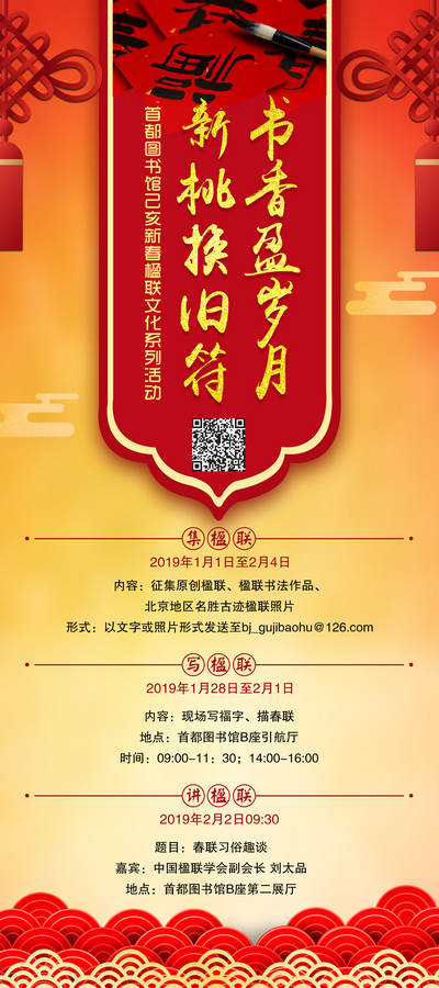 2019年1月28日,“书香盈岁月,春桃换旧符”系列活动之“现场写春联”在首都图书馆B座引航厅如期举行,活动主办方为北京市古籍保护中心和首都图书馆历史文献中心。