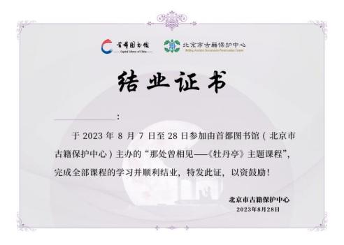 8月28日下午,“牡丹亭”主题系列课程圆满收官,首都图书馆(北京市古籍保护中心)为了鼓励线下学员的积极预约和学习,特别准备了课程证书和奖品。