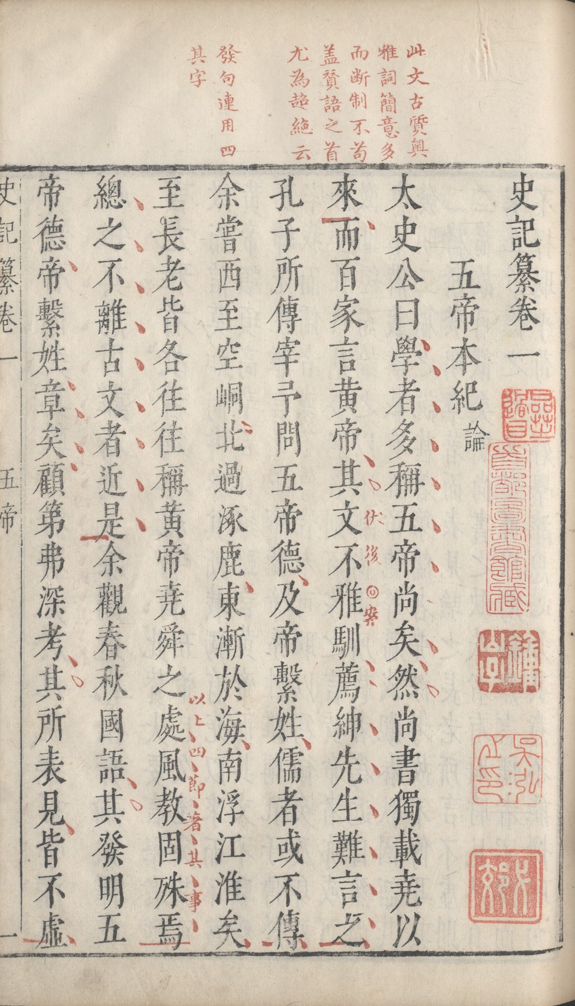 全书二十四卷,依《史记》次序排列,以《报任少卿书》附后。《史记》原文以墨色大字单行刷印,卷内各篇所择章节,凌氏自拟小题,以墨色小字双行列于篇名之下。凌氏及所引诸家评点,皆以朱色软件小字刊于书眉。唯邓以讃、张之象等前人评语以“某某曰”开首,行六字,凌氏自评则直书其文,行五字,低前人一格。此外,正文中凡句读、圈点、夹注等,亦用朱色刷印。整体版面清晰明朗,赏心悦目,既便于阅读使用,又具有相当高的艺术欣赏价值。